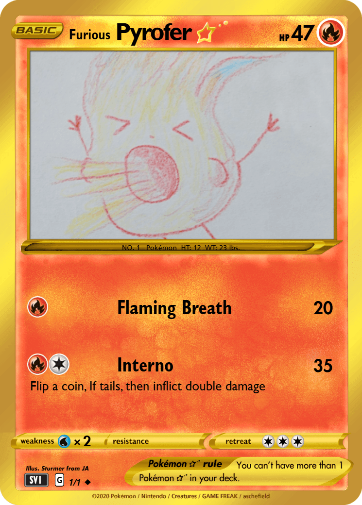 So for this bounty, we want you to design a new fire-type Pokémon card! If you entered the previous bounty, you can do this for your own Pokémon if you like, or you can take an existing Pokémon and simply create some new artwork for them on a card. You can use any format for this, but if you're doing it digitally, we'd recommend using Pokecardmaker as a template.