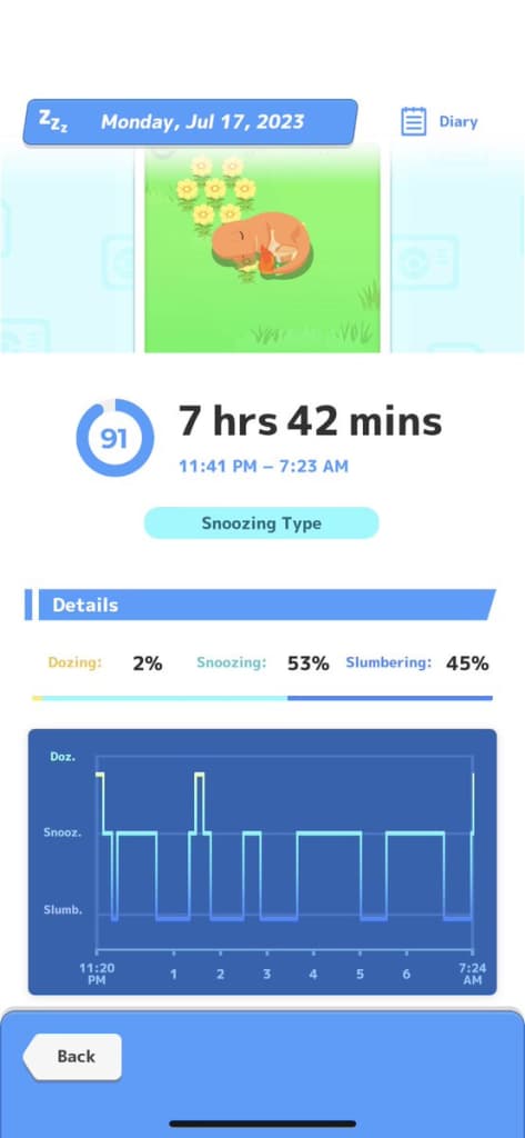 After this, you can then see what Pokémon decided to come and have a snooze around Snorlax during the night, based on how you slept – as certain types show up based on the quality of your sleep. When you start you are initially gifted a Pikachu, and after my own first session, I met a Charmander, Meowth, Flaaffy and two Rattata, representing the “snoozing” sleep style.