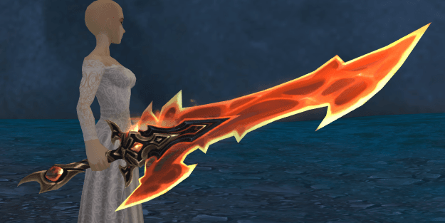 It generates a small wave of fire that travels a short distance each swing and inflicts the 'on fire' debuff. Triggers a small explosion each time it hits an enemy. It emits fiery light particles when swung.